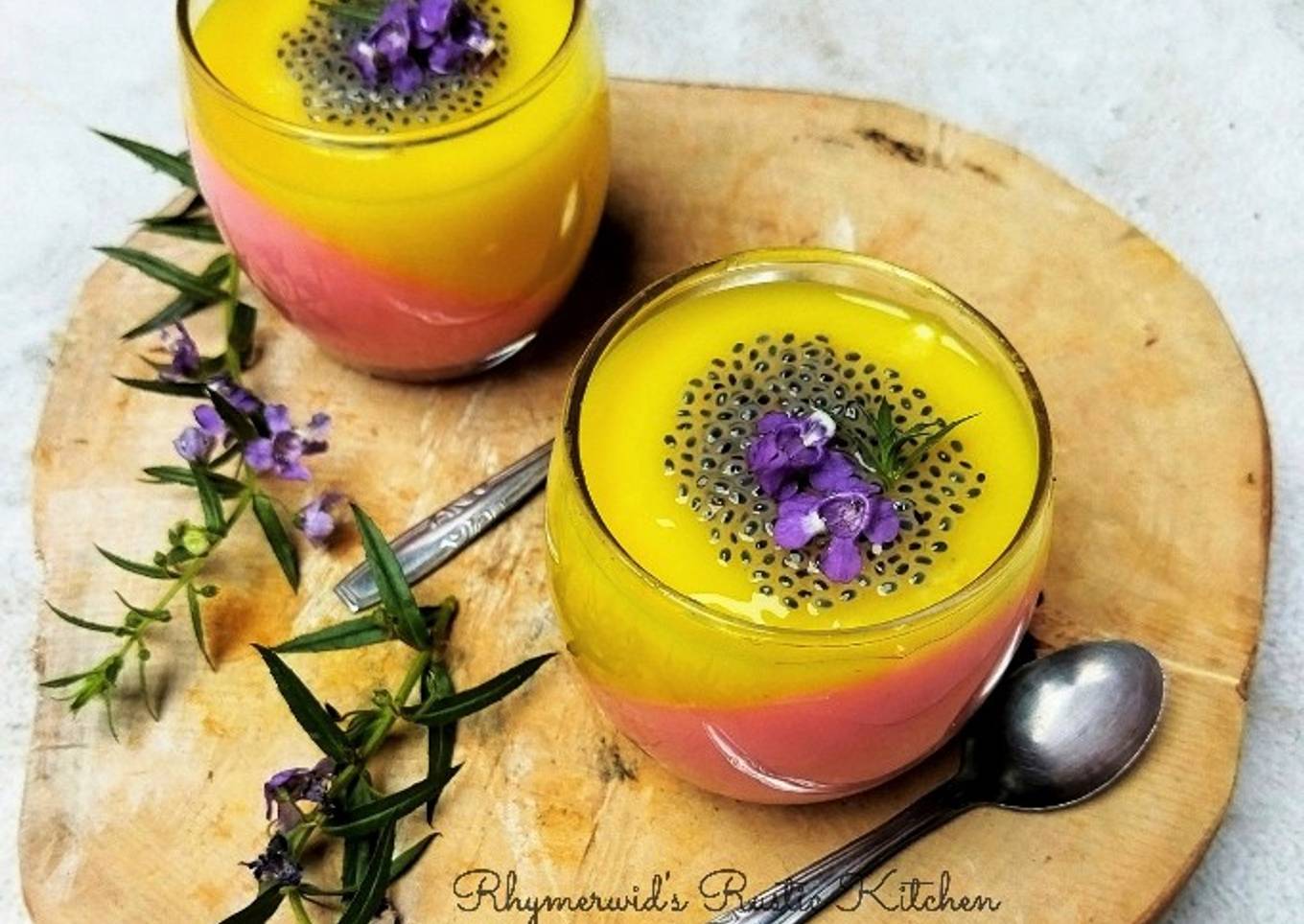 - Keluarkan puding dari kulkas, tambahkan biji selasih dan bunga lavender jika suka dan sajikan. Dan selamat mencoba.